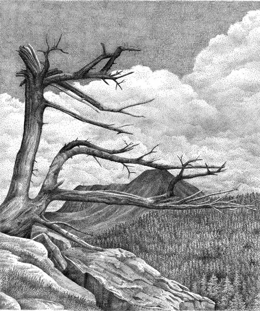Stacy-Ann Topjian Searle is a landscape artist who uses pen and ink to create detailed drawings in black and white.